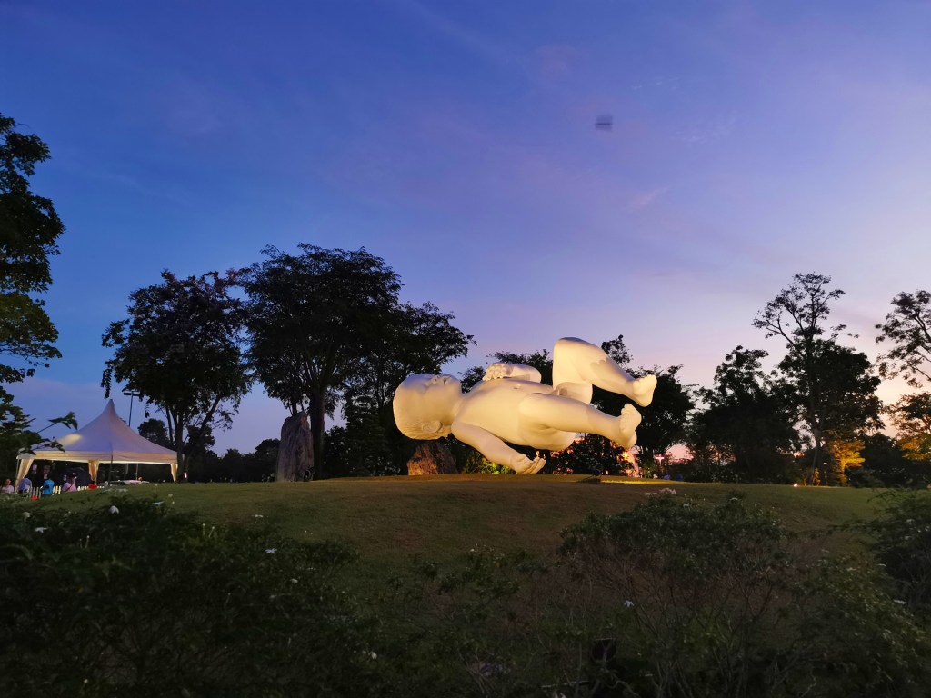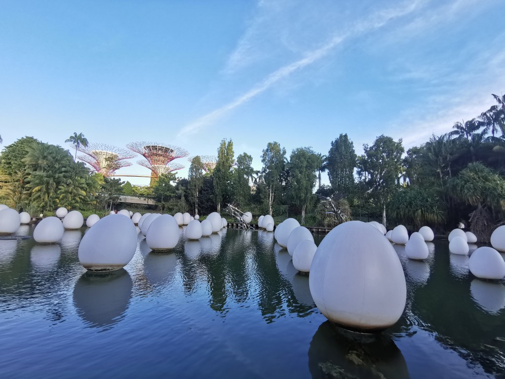 After the avalanche of photos in the Gardens, the 300 large inflated egg-shaped lights floating on the Lake at Gardens by the Bay became the stars of the evening. I found out that when people touch the oval structures located on the lake’s boardwalk, those beautiful lights change colors and in that moment each egg emits a musical note depending on the color. For me, that moment was one of the most relaxing things I’ve seen lately. Those floating eggs represent a work entitled Autonomous Resonating Life on the Water and Resonating Trees and is one of seven interactive exhibits at Gardens by the Bay’s new art exhibition. Now we need to discover the other wonderful exhibits. Singapore is full of surprises.